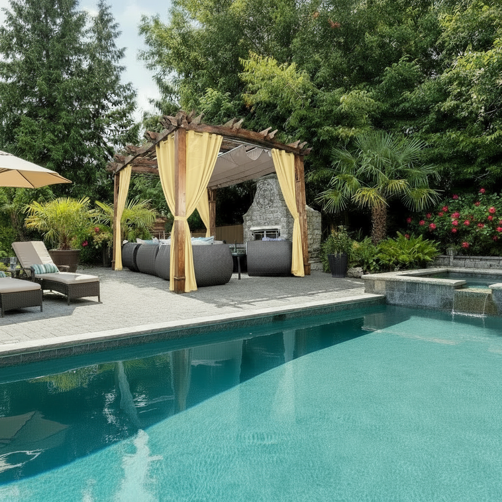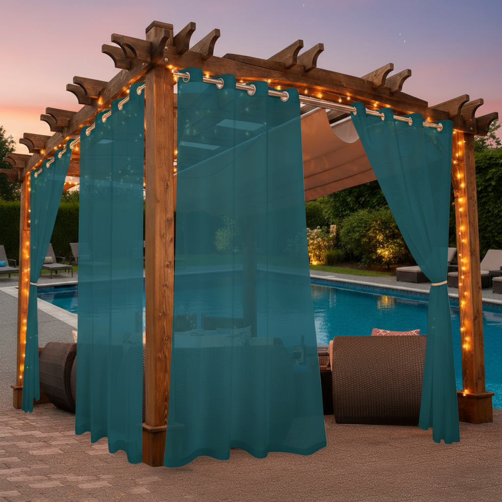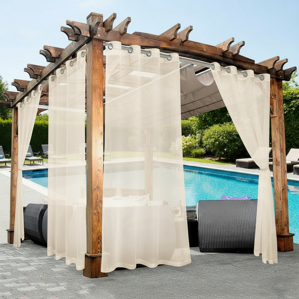 Designed for versatile outdoor and indoor use, Staccato Homes’ Grommet-Top Sheer Curtains bring comfort, privacy, and effortless elegance to cabanas, patios, poolside lounges, balconies, living rooms, and covered open-air spaces.